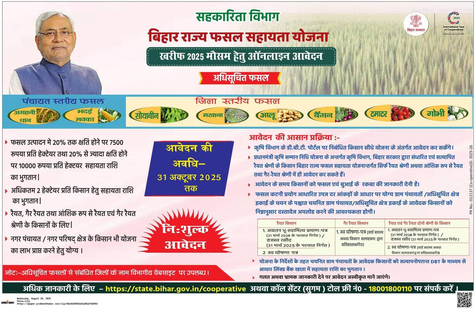 - बिहार फसल सहायता योजना खरीफ 2025 के लिए ऑनलाइन आवेदन करने की अंतिम तिथि – 31 अक्टूबर, 2025 तक।
