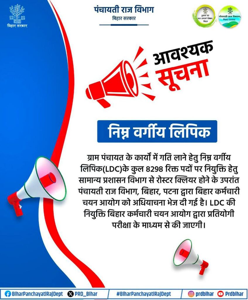 Bihar Panchayati Raj Clerk Vacancy 2025 – बिहार में पंचायत स्तर पर क्लर्क के 8298 पदों पर भर्ती के लिए अधिसूचना जारी, जाने आवेदन करने की सम्पूर्ण जानकारी