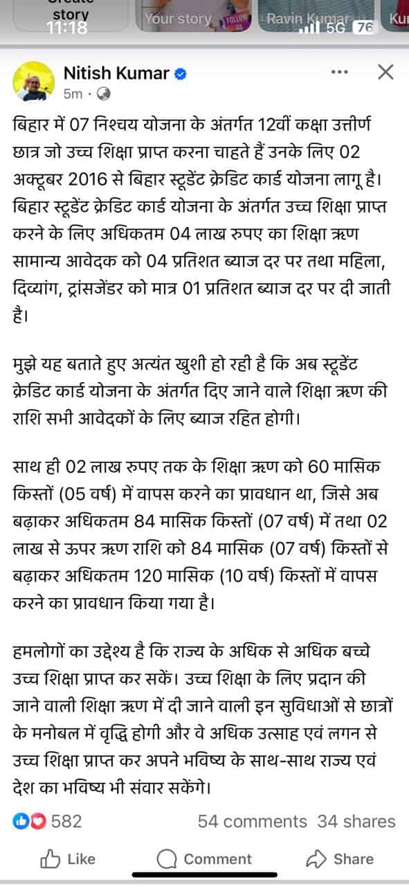 Bihar Student Credit Card Yojana New Update – बिहार के मुख्यमंत्री द्वारा सोशल मीडिया पर दी गई जानकारी?